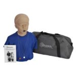 Manikins include rib cage, xiphoid process, suprasternal notch to provide anatomical reference, foreign body for airway obstruction, shirt, and soft carry bag.